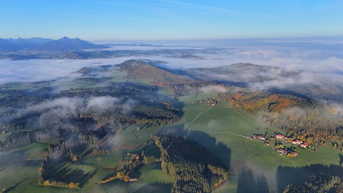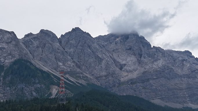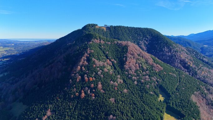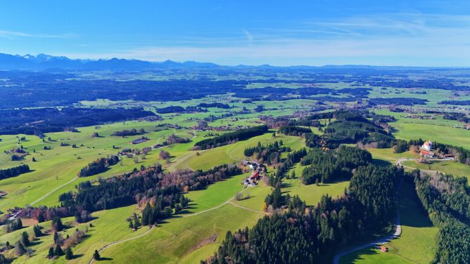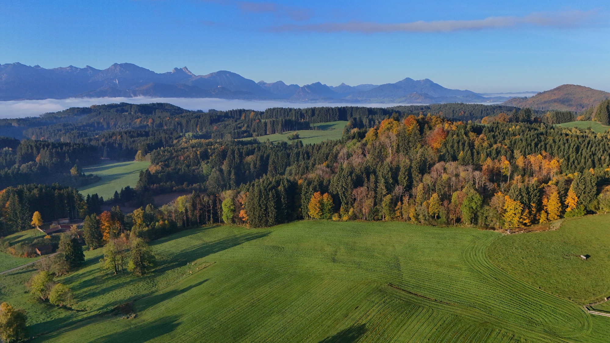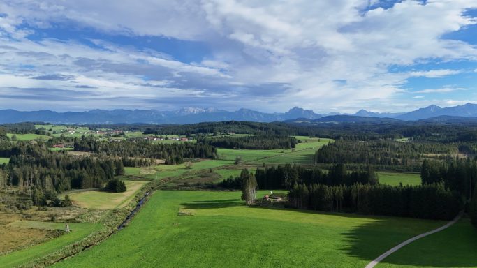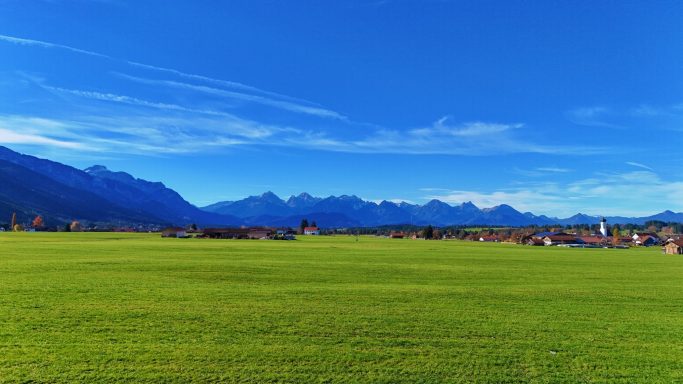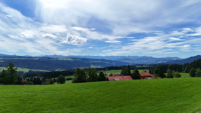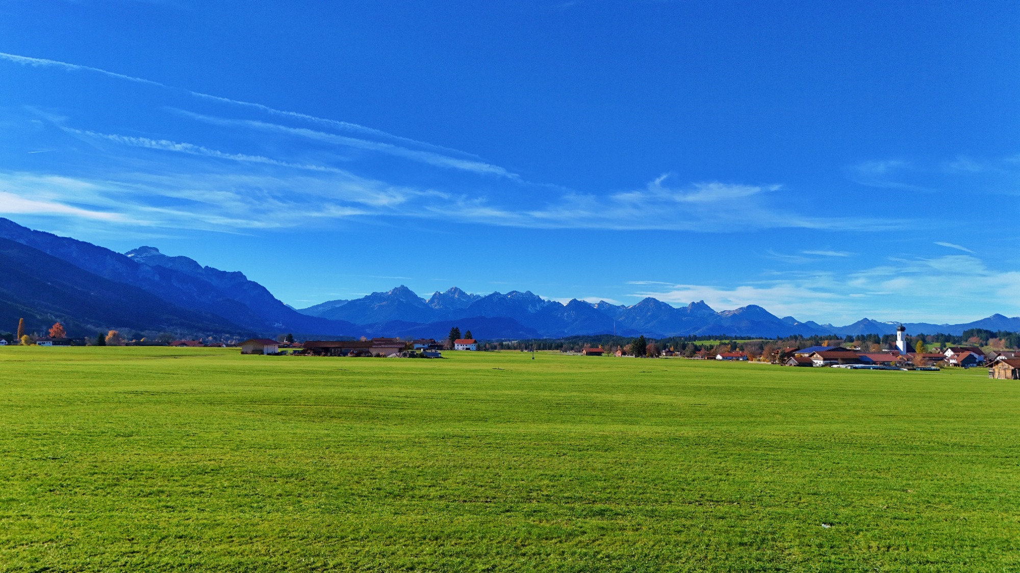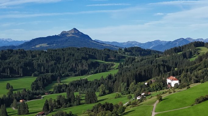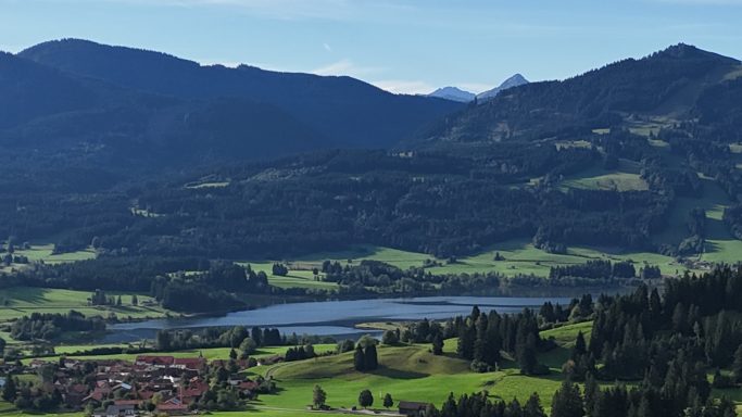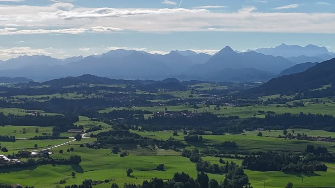 Blick bis zum Säuling bei Füssen und rechts daneben das Zugspitzmassiv