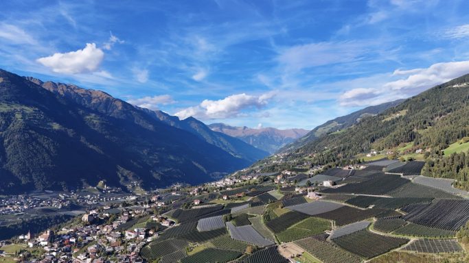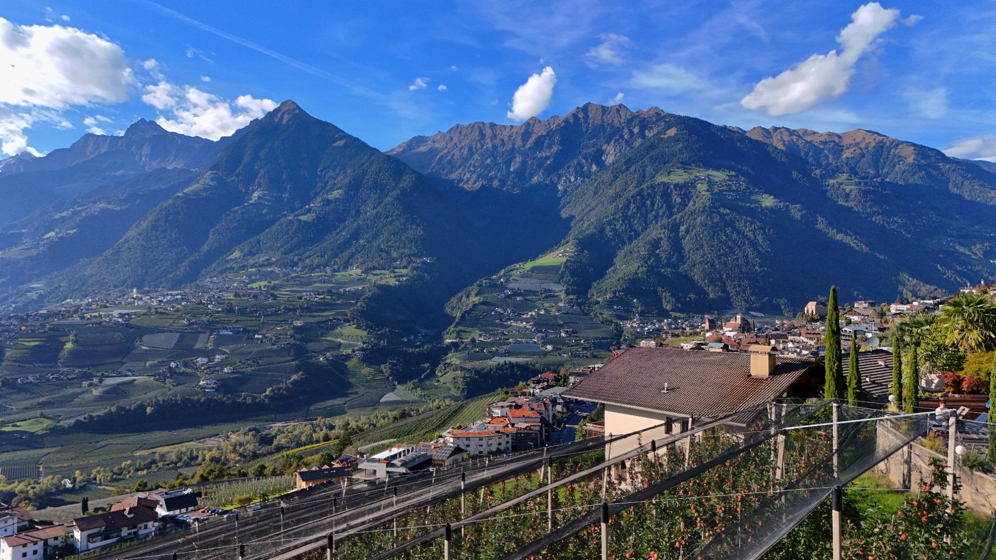 Oberhalb von Meran überall Apfel- und Weinplantagen